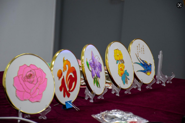 随后,师生根据制作步骤纷纷动手尝试。绘画、上胶、掐丝、剪丝、着色,用金丝细细勾勒出轮廓,用釉料逐步填充色彩。看似普通的金丝,在一番弯折处理后,构成一个个精巧细致的图案。捋丝、沾丝、点蓝填砂、淋膜,一幅幅掐丝珐琅画,在师生们指尖流转间,逐渐显现各种美丽的样貌。