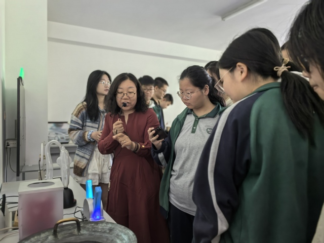 在实验中心,实验室负责人白秀丽老师结合基础物理实验设备,阐释科学原理并指出与当下工程应用的关联性。学生走进自动化控制实验室,观摩工业机器人装配单元的操作演示。