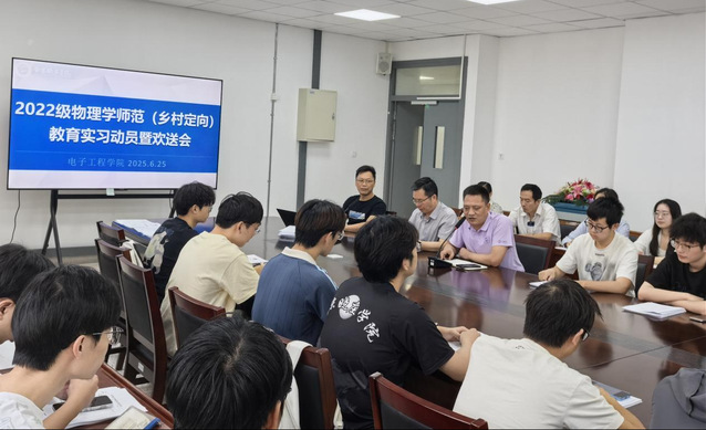 为扎实做好教育实习工作,助力乡村定向师范生成长成才,6月25日,电子工程学院召开2022级物理学(乡村定向)师范生教育实习动员大会。副院长宋永献、副书记、副院长祝中华、实习带队教师以及教务办老师参加,会议由李洪敬老师主持。