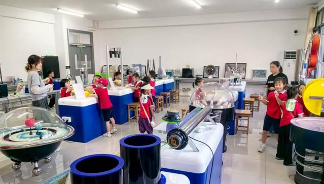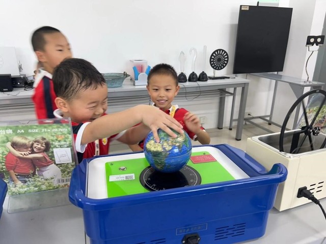 活动现场,电子工程学院师生为小朋友们精心准备了十余项趣味科技项目,涵盖声、光、电、磁及力学等多个基础物理领域,包括无皮鼓、声控喷泉、三基色原理(RGB混色灯)、穿墙而过、笼中鸟(视觉暂留)、万丈深渊(半透半反镜)、能量穿梭机(小球轨道)、磁悬浮地球仪、静电感应起电机、手摇发电机、电磁炮演示模型、三球仪(日地月模型)等。在志愿者的引导下,孩子们亲手操作各类设备,沉浸式感受科技的神奇魅力。当看到无皮鼓在没有鼓皮的情况下能发出声音,声控喷泉随着音乐节奏不断变换高度、RGB混色灯绽放出绚丽多彩的光芒,磁悬浮地球仪稳稳地悬浮在空中时,孩子们眼中满是惊喜,连连发出惊叹。这种“玩中学、学中玩”的互动体验模式,让孩子们在轻松愉快的氛围中不仅学到了科学知识,还锻炼了观察能力、思维能力和动手能力,对基础物理原理有了初步且直观的认知。