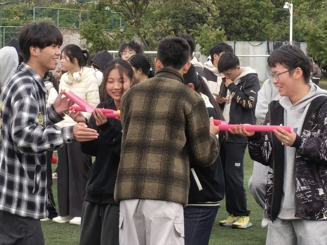 本次运动会以班级、团支部为基本参赛单元,设置了多项兼具趣味性与协作性的集体项目。在4×100米接力赛中,各班组队选手配合默契,交接棒流畅顺利;拔河比赛现场气氛热烈,口号声、呐喊声此起彼伏;“千里传珠”“六人七足”等特色项目更是考验着各班团的团队协作能力,队员们通过默契配合、相互鼓励,共同完成比赛任务。