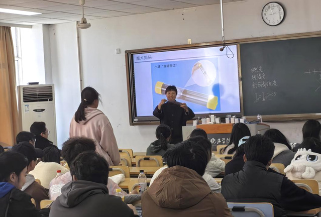 11月27日,物理学专业张颖颖老师带来了《大学物理(二)》课程思政示范课。在张老师深度挖掘专业课程中蕴含的思政元素,将科学精神、探索精神、家国情怀等自然而巧妙地融入物理知识讲授中,做到了“润物细无声”实现知识传授与价值引领的有机统一。 课堂教学还采用了实验演示、分组实验、互动协作等方式,通过引导学生动手操作、观察现象、分析结果,既加深了对物理概念的理解, 极大地调动了学生的学习兴趣和课堂活跃度,也培养了学生的实践能力和科学素养。