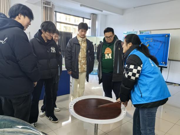 随后,师生来到物理科普实验基地。科里奥利力演示装置中小球的运动轨迹引发大家驻足思考,志愿者同步讲解了相关物理原理,并引导同学们亲身体验角动量守恒、波粒二象性等互动实验,在动手操作中深化对科学规律的理解。