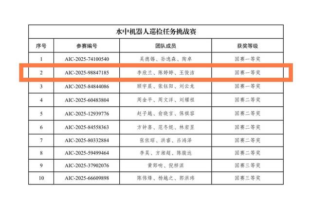 2025 年 12 月 6 日至7日,第七届全球校园人工智能算法精英大赛总决赛在北京邮电大学举行。我院李欣兰、陈婷婷和王俊洁等三名同学组队首次参加算法应用赛道“水中机器人巡检任务挑战赛”,团队凭借21秒零失误巡检8个漏油点的稳定表现,斩获该项挑战赛国赛一等奖(亚军),实现该赛项国奖“零的突破”。