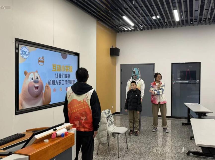 随后,“机器人总动员”环节以互动问答形式展开。实践团的志愿者生动地讲解机器人的“大脑”(控制器)、“感官”(传感器)与“手脚”(执行器),并引入扫地机器人、送餐机器人等生活实例,帮助孩子们理解机器人的工作原理。现场还设置了“模拟机器人工作流程”小实验,邀请小朋友互动,深化对机器人技术的认识。