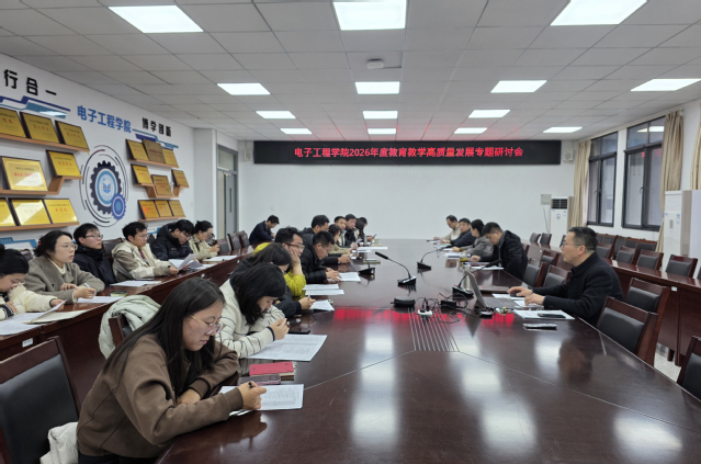 3 月 17 日下午,电子工程学院召开 2026 年度教育教学工作专题研讨会,系统总结 2025 年教育教学工作成效,分析现存问题,部署年度重点任务,共谋学院高质量发展新路径。学院党委书记薛同琦,各教研室主任、专业负责人,教务办工作人员及青年教师代表参会,会议由副院长宋永献主持。