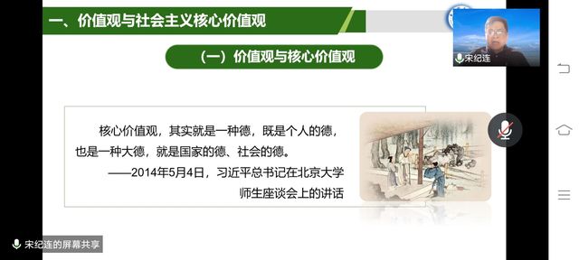 首先,宋老师阐述了社会主义核心价值观的含义,社会主义核心价值观是社会主义核心价值体系的内核,体现社会主义核心价值体系的根本性质和基本特征,反映社会主义核心价值体系的丰富内涵和实践要求,是社会主义核心价值体系的高度凝练和集中表达。社会主义核心价值观分别从国家、社会、公民个人三个层面提出社会主义核心价值观的价值目标、价值取向和价值准则。宋老师引用习近平总书记在2014年5月4日北京大学师生座谈会上的讲话:“核心价值观其实就是一种德,既是个人的德,也是一种大德,就是国家的德、社会的德。”宋老师为学员们阐述了社会主义核心价值观的具体内容、时代意义。最后,宋老师勉励学员要积极培育和践行社会主义核心价值观,并指出:“培育和践行社会主义核心价值观就是当代中国发展进步的精神指引,是有效整合我国社会意识、凝聚社会价值、聚合磅礴之力的重大举措,是保证我国经济社会沿着正确的方向发展的精神支撑。”