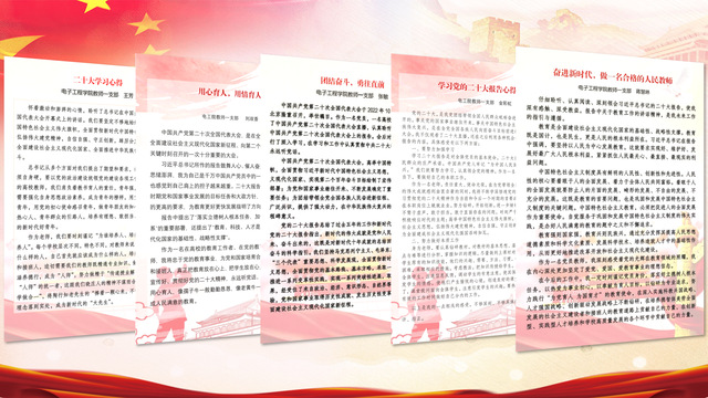 党的二十大召开以来,电子工程学院党总支迅速行动、精心组织、周密部署,积极开展“五个一”专题活动,学院师生坚持学思悟贯通,知信行统一,努力在学习贯彻党的二十大精神中做到学深悟透、慎思笃行。