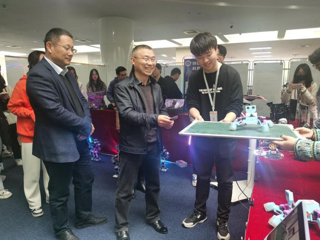 展台前,讲解员为前来参观的老师和同学们详细讲解了展品的制作过程、应用场景及改进方向。副校长鲁学军饶有兴致地来到四足爬坡机器人展台前亲自体验操控。并为我们展品在程序优化、硬件外观设计等方面提出了宝贵的建议。