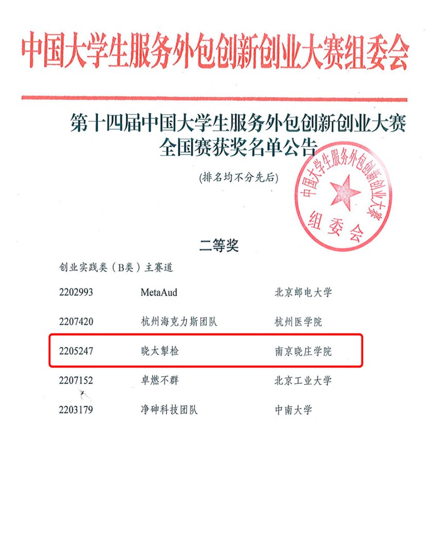 8月6日-8月8日,由教育部、商务部、无锡市人民政府联合主办的第十四届中国大学生服务外包创新创业大赛全国总决赛在江苏无锡举行。我院学生团队“晓太掣检”(参赛学生:吴佳恩、童嘉雯、董备、邵义凡、陈靖奕,指导老师:王芳)获得创业实践类(B类)主赛道国赛二等奖。